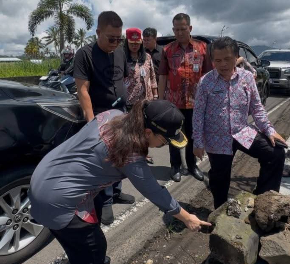 Tondano – Didamping Kadis PUPR Wakil Bupati Minahasa, Ibu Vanda Sarundajang, SS, langsung turun ke lapangan pada Kamis (16/10/2025) untuk meninjau kondisi ruas Jalan Boulevard Tondano yang kembali tergenang air pasca hujan deras.