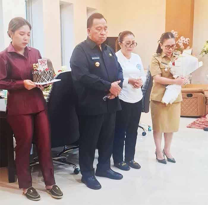 MINAHASA – Suasana penuh kehangatan terlihat di Ruang Kerja Bupati Minahasa, Senin (11/8/25), ketika Bupati Minahasa Robby Dondokambey, S.Si., MAP bersama Ketua TP-PKK Kabupaten Minahasa, Martina Dondokambey-Lengkong, S.E., memberikan kejutan selamat ulang tahun kepada Wakil Bupati Minahasa, Vanda Sarundajang, S.S.